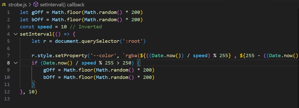 This code stores a color in the CSS variable --color. The color is dependent on time in order to produce a smooth transition effect and is randomized every once in a while.